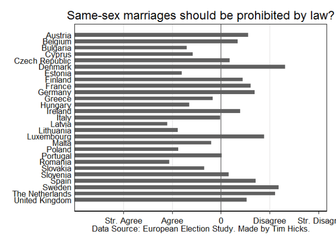 I was just working on the European Election Study data from 2009 (for wholly unrelated reasons). It turns out they asked respondents to indicate whether they agree or disagree with the statement, “Same-sex marriages should be prohibited by law”. Some very quick code with Stata yielded the following figure.